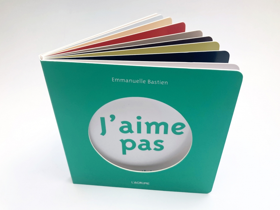 J’aime pas : les fantômes, la varicelle, les crottes de bique, le shampoing… Un inventaire poétique et amusant, illustré uniquement par des aplats de couleurs et des ronds découpés dans les pages. Grâce à la magie de la superposition, un rond rose devient un trou dans la chaussette, des petits ronds jaunes des noyaux de cerise, et de grands ronds blancs le lait en ébullition. Une expérience ludique et surprenante qui stimule le regard des tout-petits. Emmanuelle Bastien reprend le principe de J’aime pour proposer un deuxième album en miroir, toujours aussi fort et sensible.