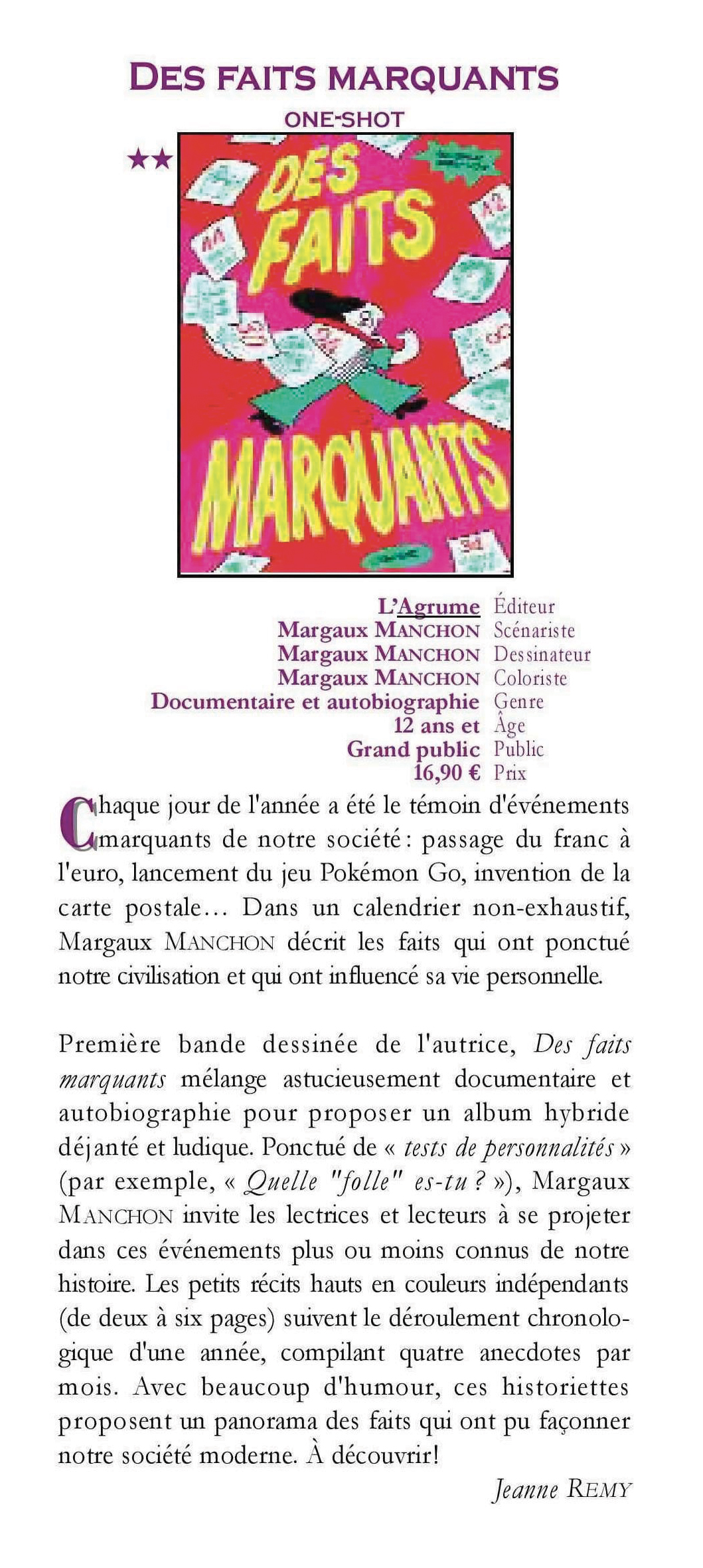 « Avec humour et ironie, sans aucune objectivité, l’autrice nous balade dans des faits historiques, petits ou grands, pour mieux éclairer certaines zones d’ombre de ces histoires populaires. On en redemande ! » – Canal BD