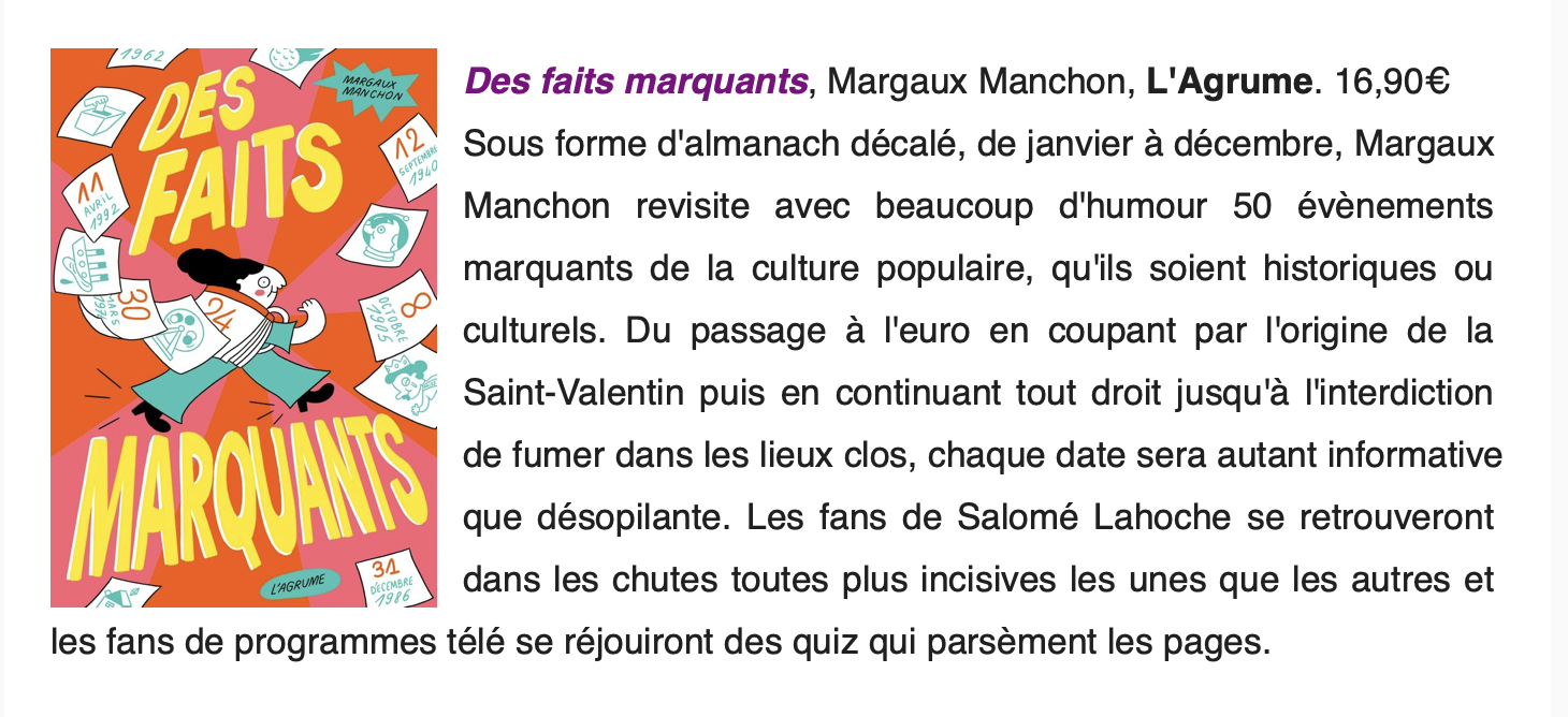 12 novembre 2025/ Presse /par Guillaume Griffon « Les fans de Salomé Lahoche se retrouveront dans les chutes toutes plus incisives les unes que les autres » – Librairie La Madeleine, Lyon